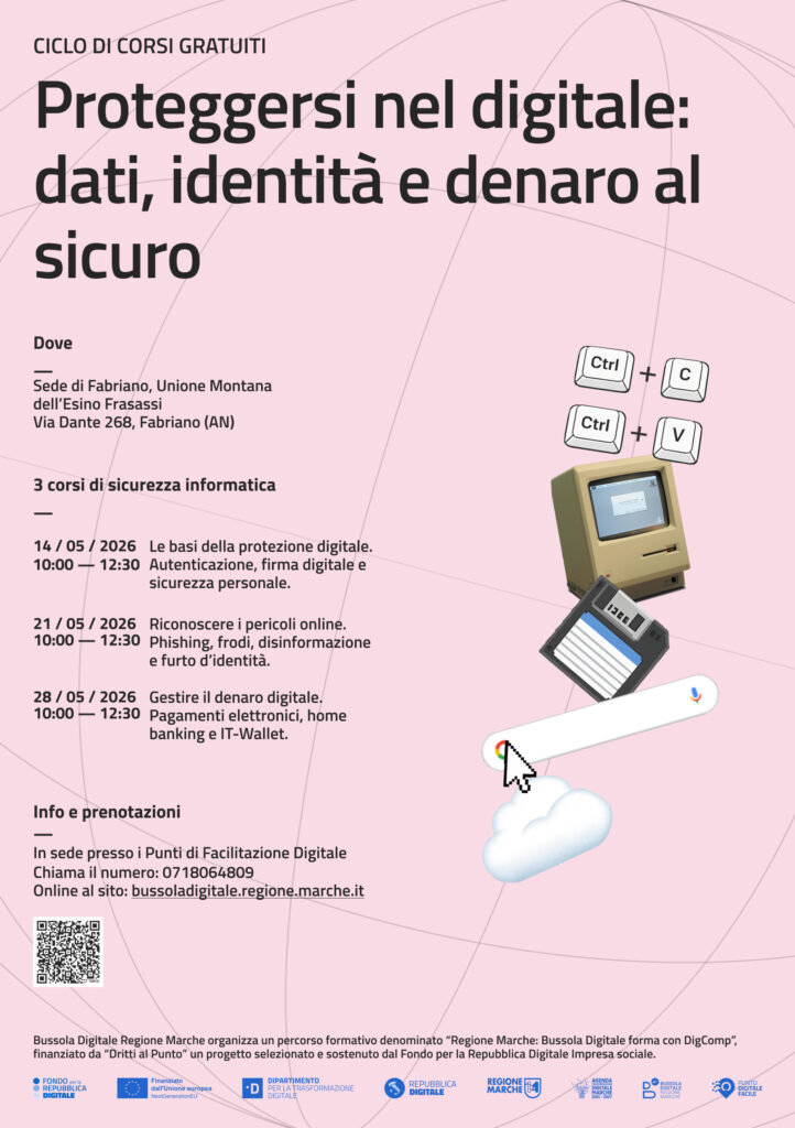 HomeNotizieBUSSOLA DIGITALE – CICLO DI CORSI GRATUITI – “PROTEGGERSI NEL DIGITALE: DATI, IDENTITÀ E DENARO AL SICURO” BUSSOLA DIGITALE – CICLO DI CORSI GRATUITI – “PROTEGGERSI NEL DIGITALE: DATI, IDENTITÀ E DENARO AL SICURO” ⋮ Vedi azioni Stampa Invia Twitter Facebook LinkedIn Data: Aprile 30, 2026 BUSSOLA DIGITALE – CICLO DI CORSI GRATUITI – “CREARE NEL DIGITALE: DAI DOCUMENTI ALL’INTELLIGENZA ARTIFICIALE”